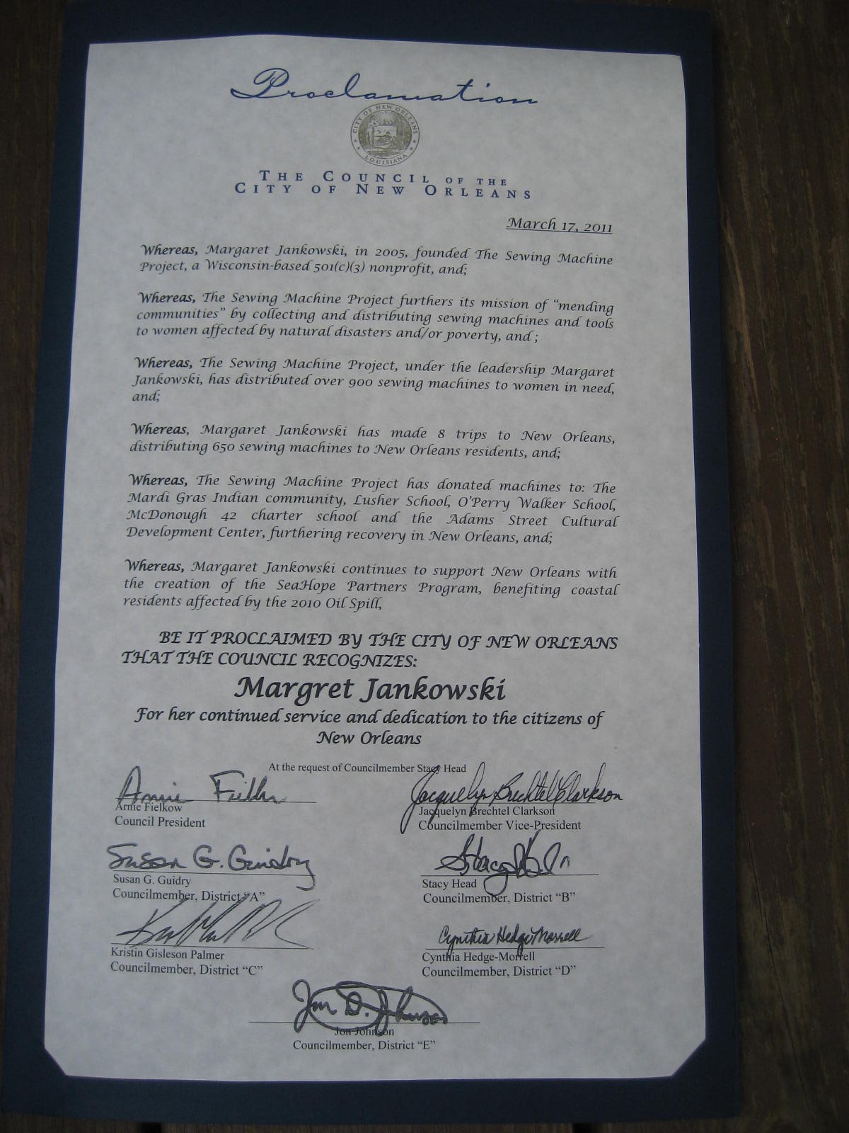 The New Orleans City Council issued a proclamation today recognizing the work of The Sewing Machine Project. Cherice Harrison-Nelson went with me to the meeting to receive the award.