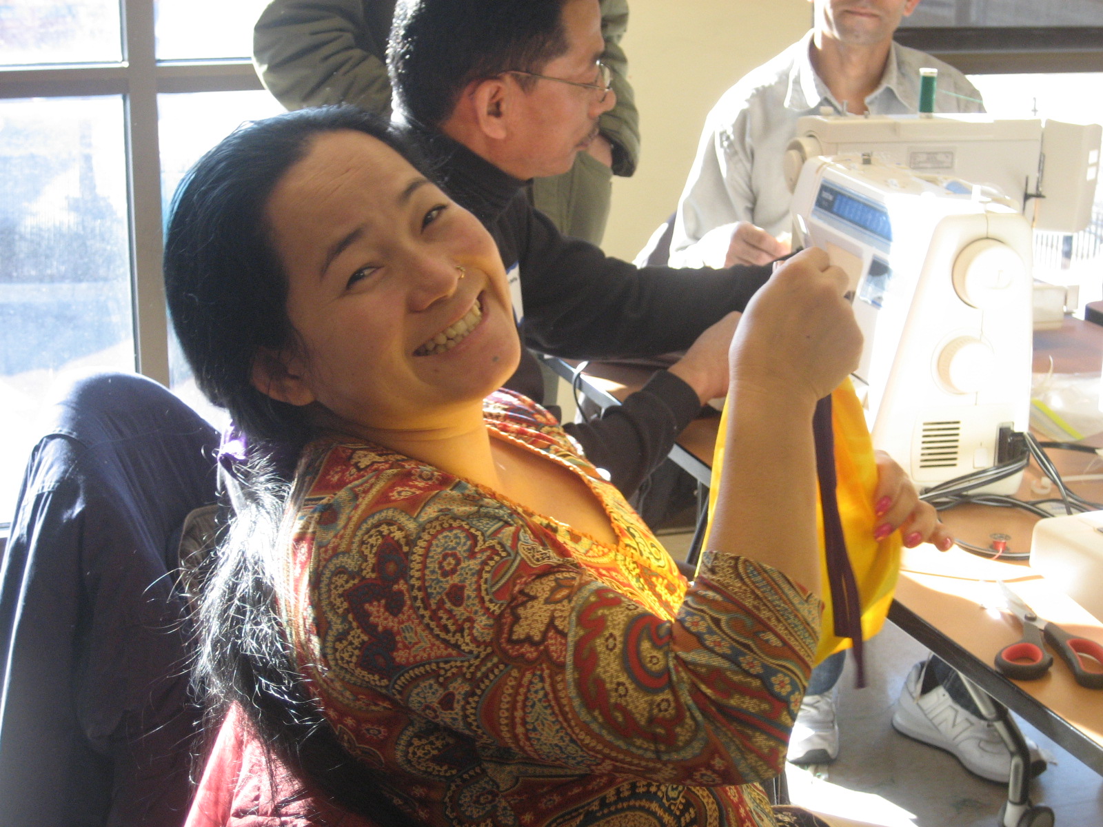 I asked Steffani Lincecum, a board member, to head up this initiative and she grabbed the opportunity. Steff’s combination of sensitivity, creativity, organization and gentleness was perfect for the task. On Wednesday Steff and I, along with Lois, Trish, and Bird (also on the board) met with our first group. We weren’t sure if anyone had used a machine or if we’d be able to communicate, given the language barrier (people from this area of Bhutan speak Nepali). Chaotic? yes! Busy? yes! Beautiful? most definitely! Everyone’s off to a good start, all at different level. Communication is tricky but the language of friendship and kindness is present and we’re all doing our best.
