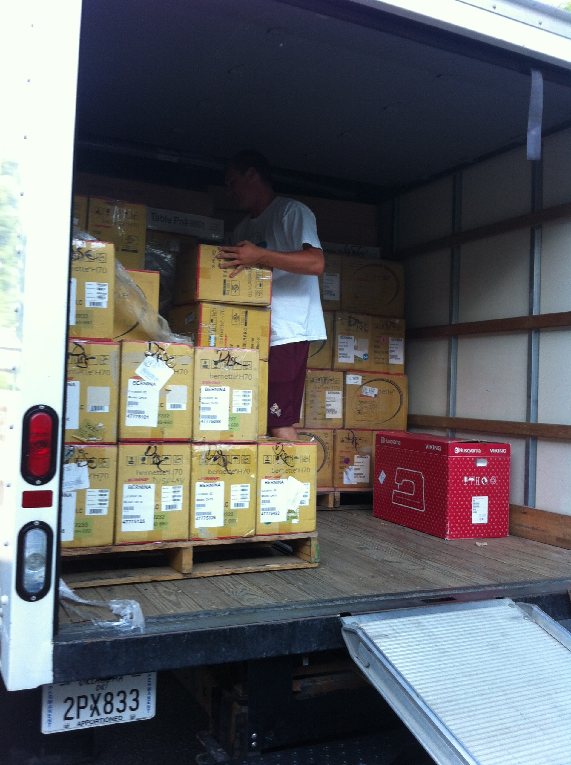 It took a few months to pull it together but last Friday I drove down to Aurora with Becky Jollay (volunteer extraordinaire…) in a rented 16′ truck to pick up the machines. 325 sewing machines later we were on our way back! We’ll need to check over the machines to make sure they’re working properly but wow!!! what a gift!