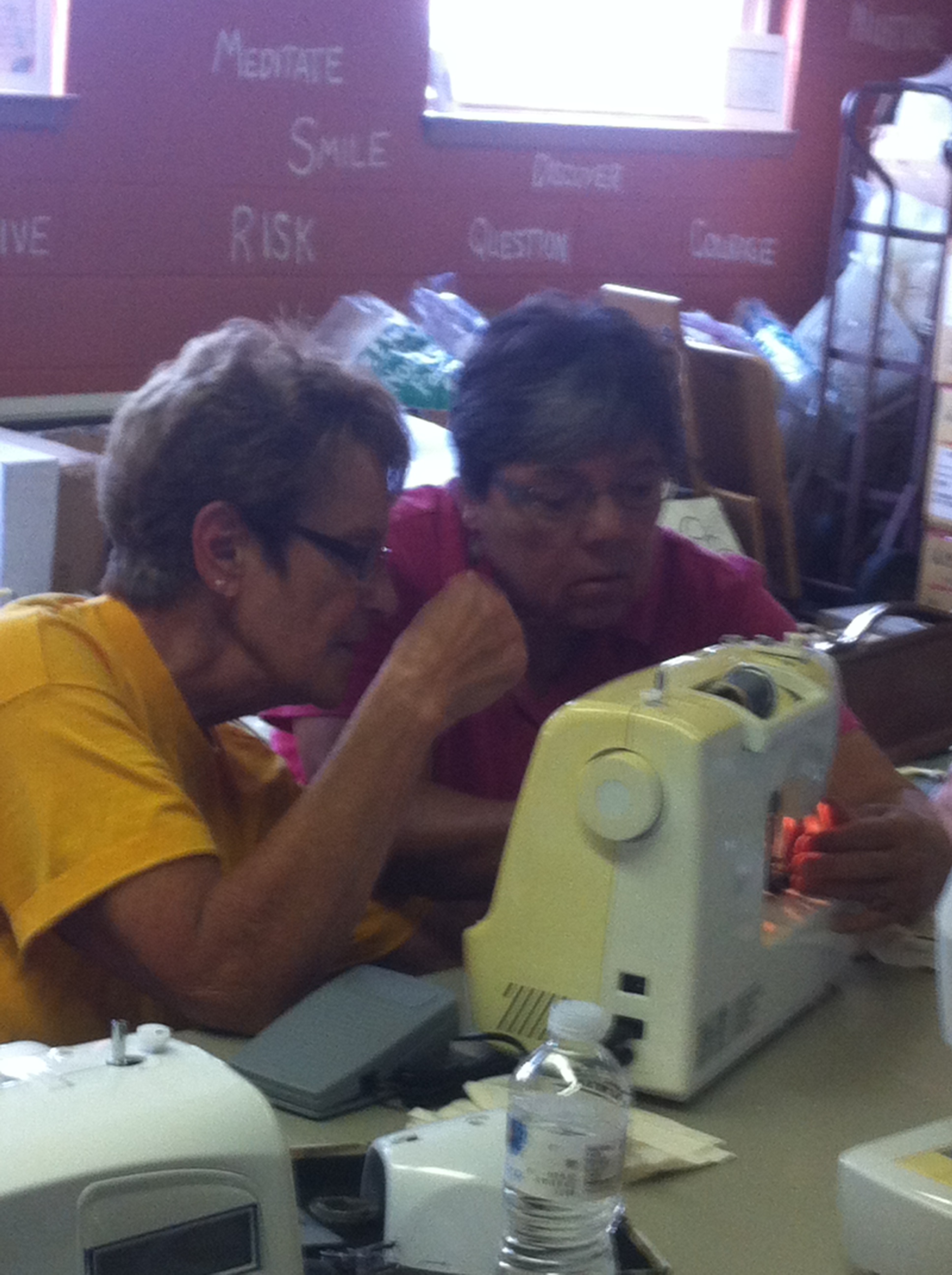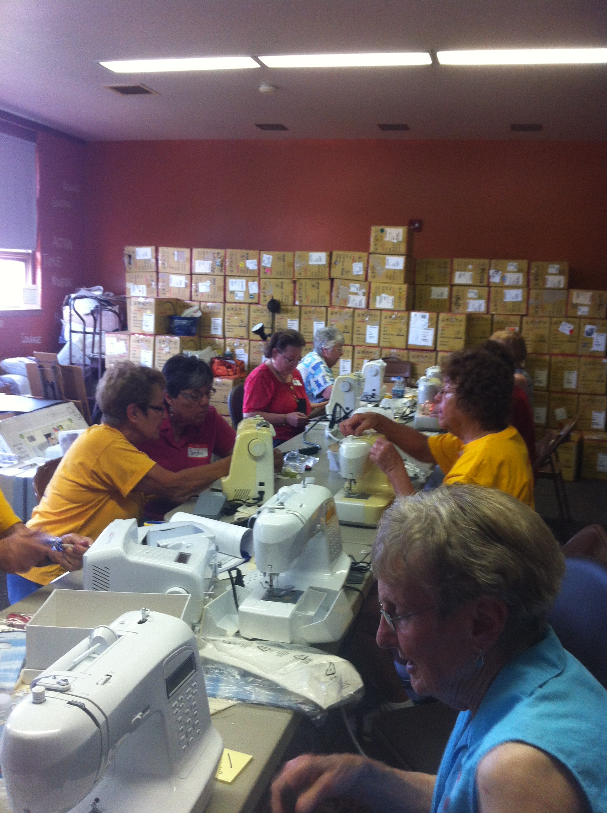 So I asked for help. Once again, the sweet retired (mostly!) volunteers from Oscar Mayer came to my rescue. And even more! Friends, board members…everyone came to the party! Smiling and laughing, helping each other, we worked through as many machines as we could. Our goal was to end up (after two work days) with 85 useable machines to send to Guatemala. We ended up with 125!!Everyone helped so much! From unpacking and repacking machines to sewing on and testing machines to fixing broken circuit board…everyone found their niche and was such a help.